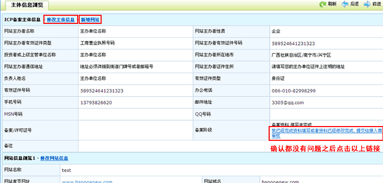 在下一步可以新增网站,可以修改之前提交的网站信息.确认都没有问题之后,点击 我已经完成资料填写或者资料已经修改完成, 提交给接入商审核确认提交之后您将不能修改.在我司还未审核之前,可以联系我司帮您修改,若备案进度是等待通信管理局审核,则需要等通讯管理局审核通过之后才可以修改.